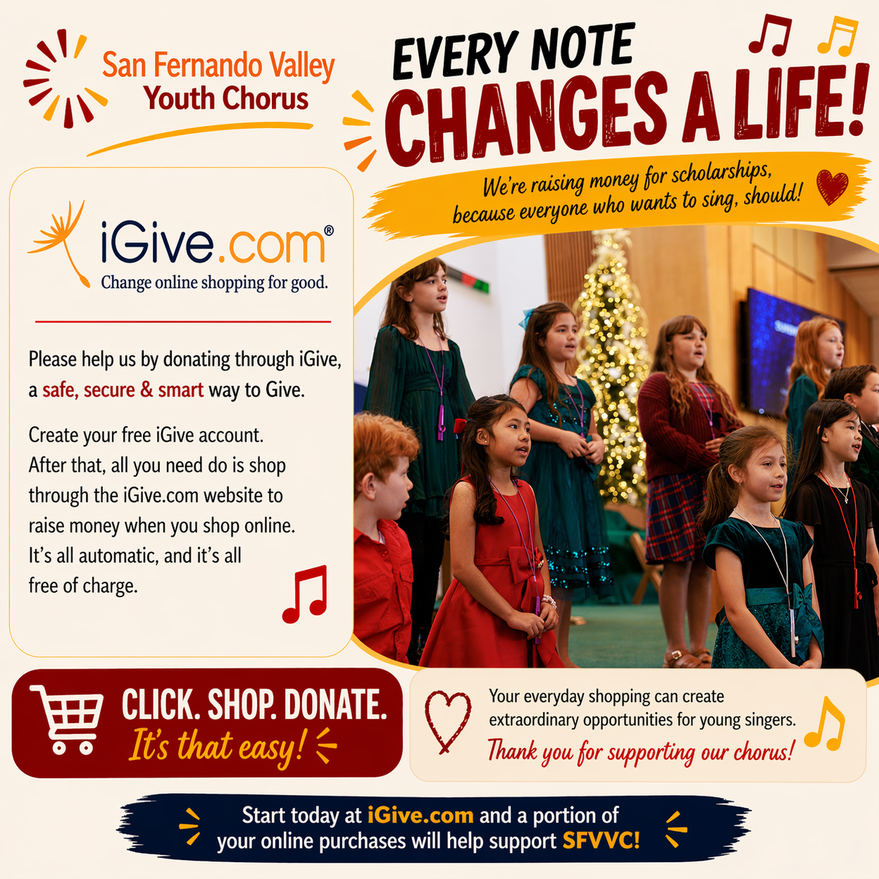 Create your free iGive account. After that, all you need to do is shop through iGive.com to help our young singers at all levels. Support our scholarship program by clicking the button to iGive to San Fernando Valley Youth Chorus.